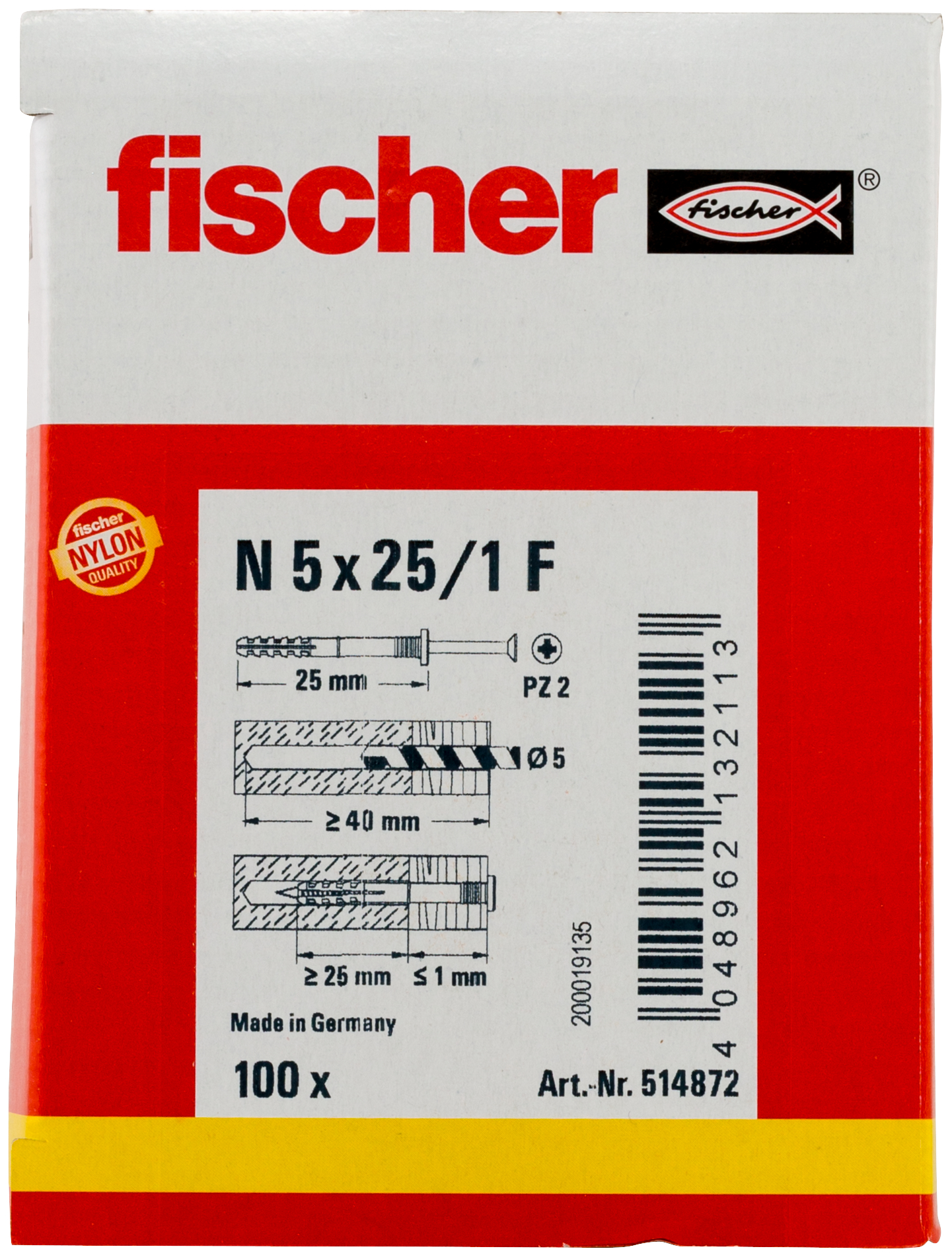 Nagelplug N 5x25/1 F platte kop VVE=100 Fischer