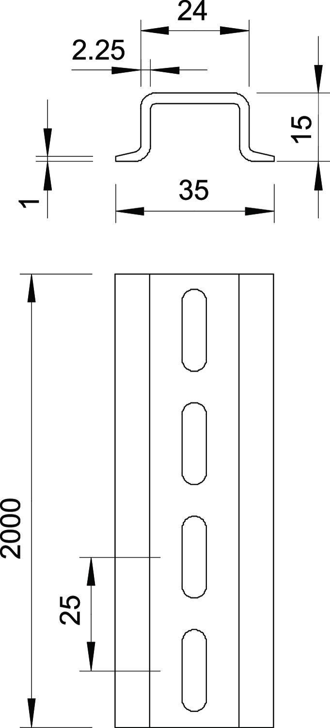 Lengte a 2m. DIN-rail geperforeerd 225mm 35x15mm staal verzinkt. OBO