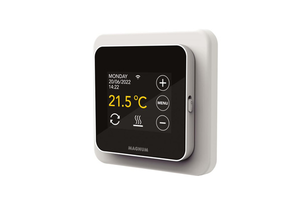 De MAGNUM Mat wordt geleverd inclusief geavanceerde WiFi thermostaat. Door het eenvoudige opstartmenu is deze thermostaat binnen 3 minuten geprogrammeerd en klaar voor gebruik. Dit menu verschijnt direct als de stroom weer op de groep wordt gezet. De ‘slow start’ functie zorgt ervoor dat de vloer in 20 dagen langzaam opgewarmd wordt. Deze functie voorkomt scheurvorming die kan optreden als de temperatuur te snel stijgt bij een nog niet volledig uitgeharde vloer.