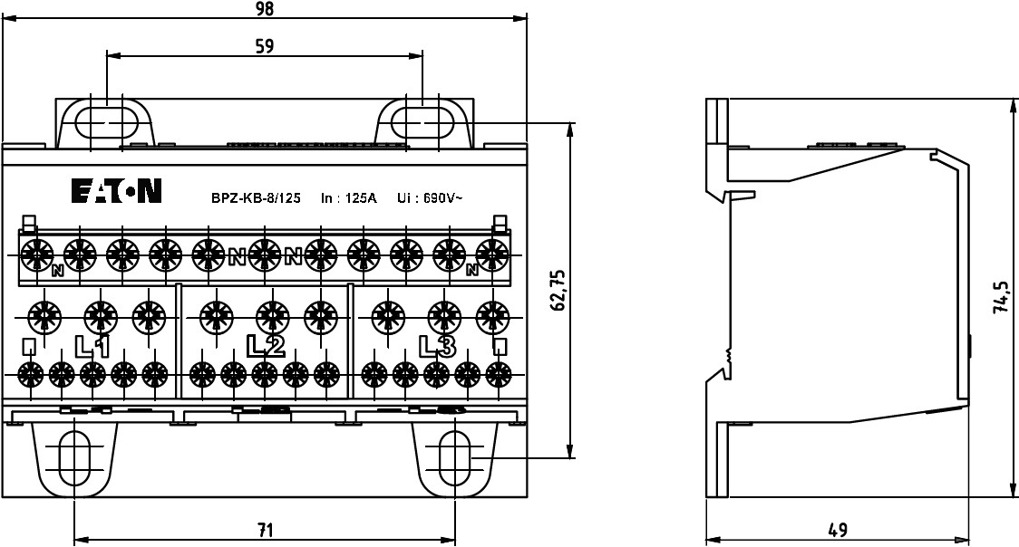 Aansluitklemmenblok BPZ-KB-8/125 4P 125A 1+7 uitg. klem Eaton